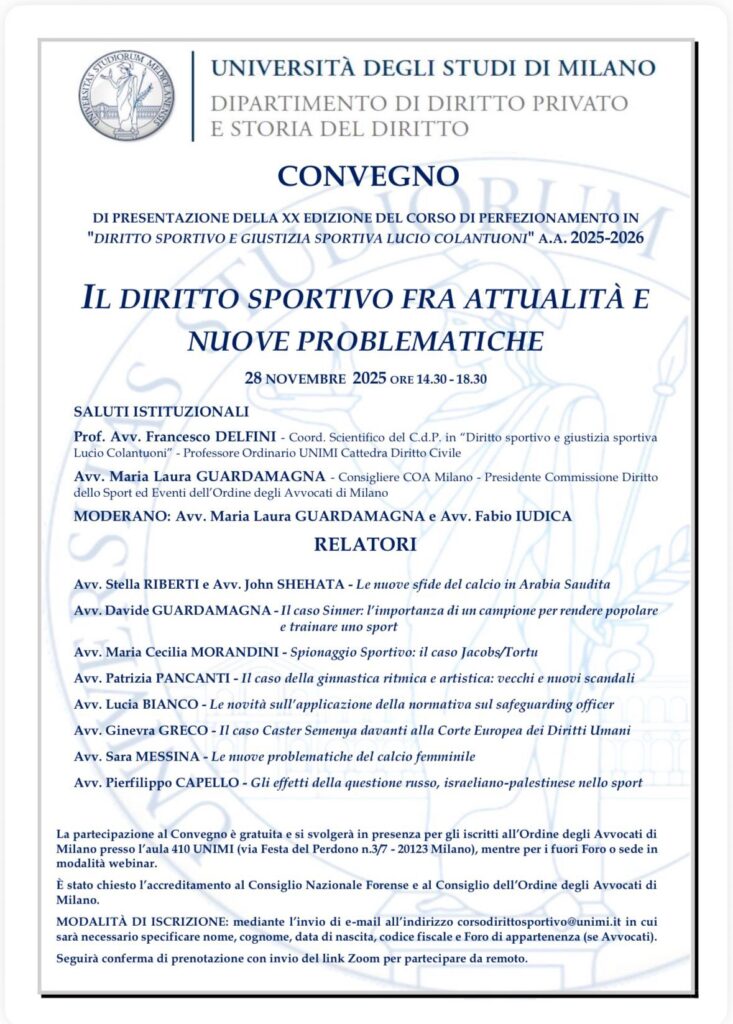 “Il diritto sportivo fra attualità e nuove problematiche”: questo il titolo del convegno che l’Università degli Studi di Milano ospiterà venerdì 28 novembre. L’evento presenterà la XX edizione del corso di perfezionamento in “Diritto sportivo e giustizia sportiva Lucio Colantuoni”, valido per l’annata accademica 2025-2026. L’appuntamento, previsto dalle 14.30 alle 18.30 presso l’aula 410 di via Festa del Perdono 3, riunirà accademici, avvocati e operatori del settore per analizzare i temi più rilevanti e le questioni emergenti nella normativa sportiva nazionale e internazionale.
