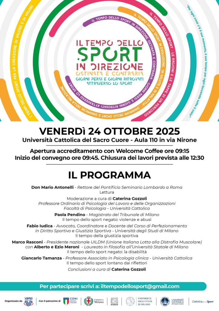 Il Consorzio Vero Volley con la sua Presidente, Alessandra Marzari, ha organizzato per venerdì 24 ottobre il terzo appuntamento de “Il Tempo dello Sport” dal titolo “In direzione ostinata e contraria – Giorni persi e giorni ritrovati attraverso lo sport”. Il convegno avrà luogo presso l’aula 110 dell’Università Cattolica del Sacro Cuore, in via Nirone 15 a Milano. La giornata è stata pensata come una preziosa opportunità di approfondire i temi e i valori che definiscono lo sport moderno.