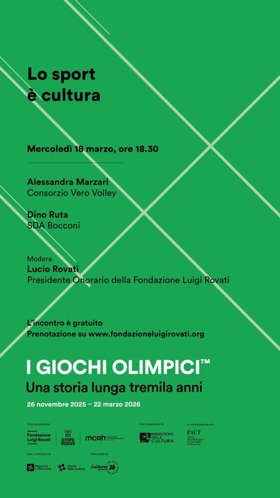 “Lo sport è cultura” rientra nel Public Program della mostra “I Giochi Olimpici. Una storia lunga tremila anni”, realizzata dalla Fondazione Luigi Rovati in dialogo con importanti istituzioni museali internazionali. L’incontro, gratuito e aperto al pubblico su prenotazione, prevede circa un’ora di conversazione e un successivo momento di domande con la platea. All’interno di un ciclo di quattro appuntamenti dedicati alla storia e all’immaginario olimpico, la tappa con Alessandra Marzari e Dino Ruta sarà un’opportunità per ribadire l’impegno quotidiano di Vero Volley nel veicolare i giusti valori sociali dello sport, dentro e fuori dal campo.
